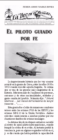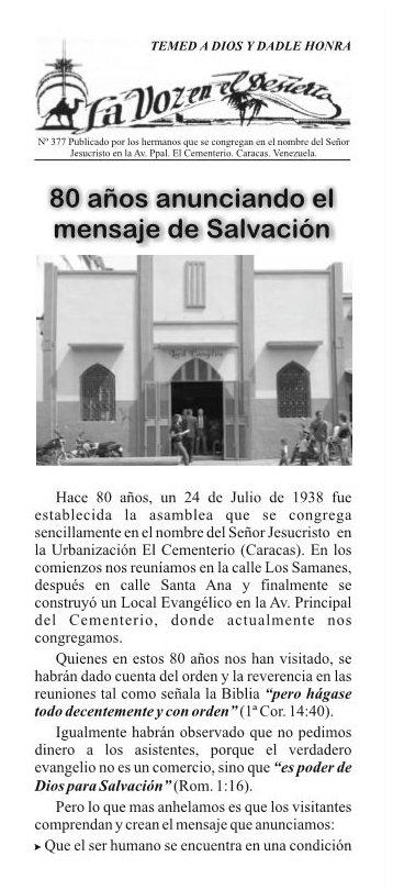 "LA VOZ EN EL DESIERTO" El Periódico La Voz en el Desierto fue fundado en el año 1949 por hermanos, principalmente jóvenes, de la asamblea de la Av. Ppal. del Cementerio. Caracas. Sus directores por muchos años fueron fueron don Jóse Naranjo y don Hildebrando Gil. Instrumentos de bendición como la Srta. Clara Viloria, el profesor Juan García, entre otros, dedicaron muchos años de sus vidas, con esfuerzo y amor, a la impresión de este precioso material evangelístico, el cual se distribuye gratuitamente en diversos lugares de Venezuela y aun en el exterior.